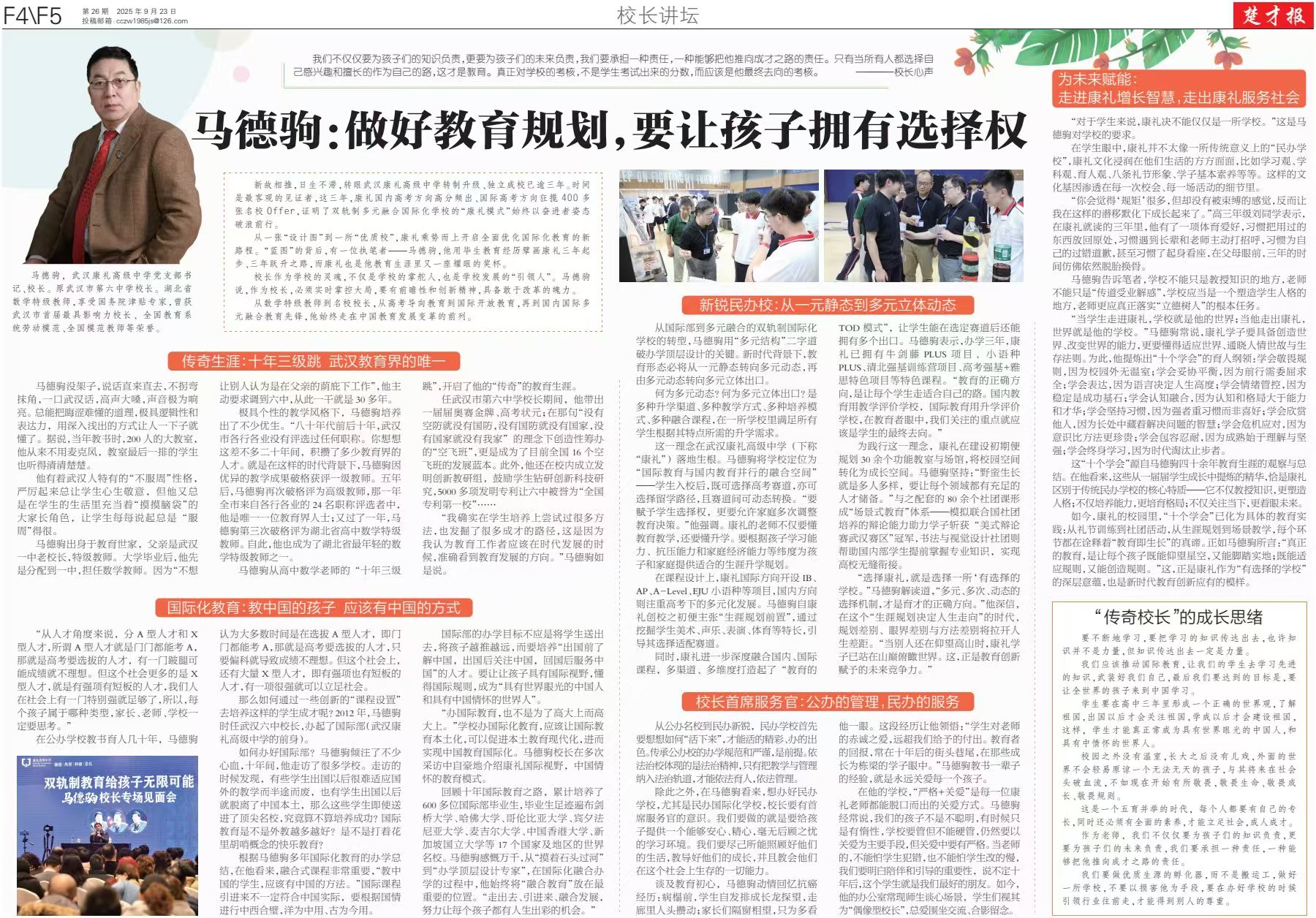 2025年10月9日,长江日报集团《楚才报·校长讲坛》栏目推出重磅专访,深度对话武汉康礼高级中学校长马德驹。本次专访以“做好教育规划,要让孩子拥有选择权”为核心主题,全面呈现这位武汉教育界传奇校长的教育智慧与实践革新。
